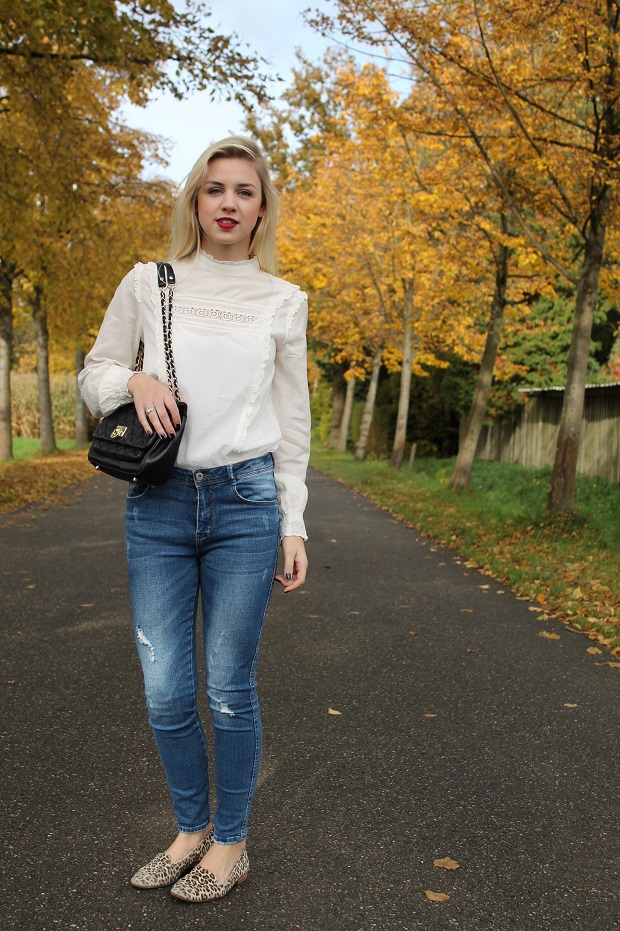 This vacation I also shot a outfit with my sister which was this ‘white romance’ one. The blouse, which is from pepe jeans, is absolutely one of my favorites, because you can wear it in daytime with a skinny jeans combined with a pair of sneaker or loafers, like I did here. You can also wear it perfectly to a party and combining it with, for example, a leather or pleated skirt. To make it less romantic I put a couple of panter printed loafers on my feet. Those shoes match perfectly with this quilted gold chain bag from DKNY. Hope you like it and I wish you all a nice sunday evening!